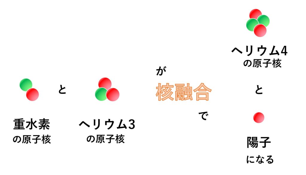 D3He核融合反応はその1つで、D:重水素と3Heの混合燃料を5億度程度まで加熱すると、この2つの物質が以下のような核融合反応を起こします。