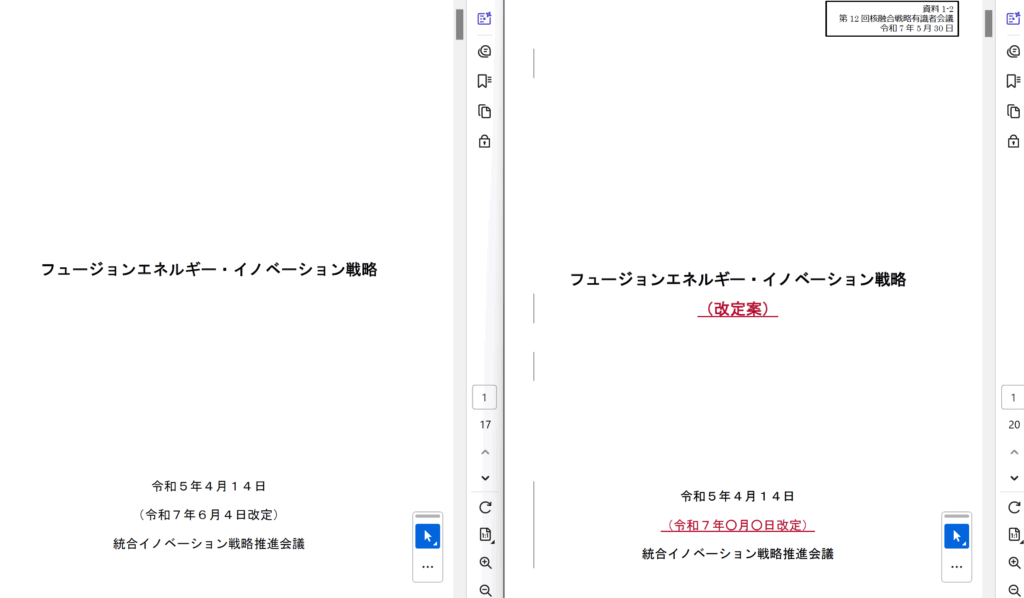 この戦略の改定箇所が赤字で明記された資料が、2025年5月30日に開催された、上の核融合戦略有識者会議の資料として掲載されています。(上の図の右側。)